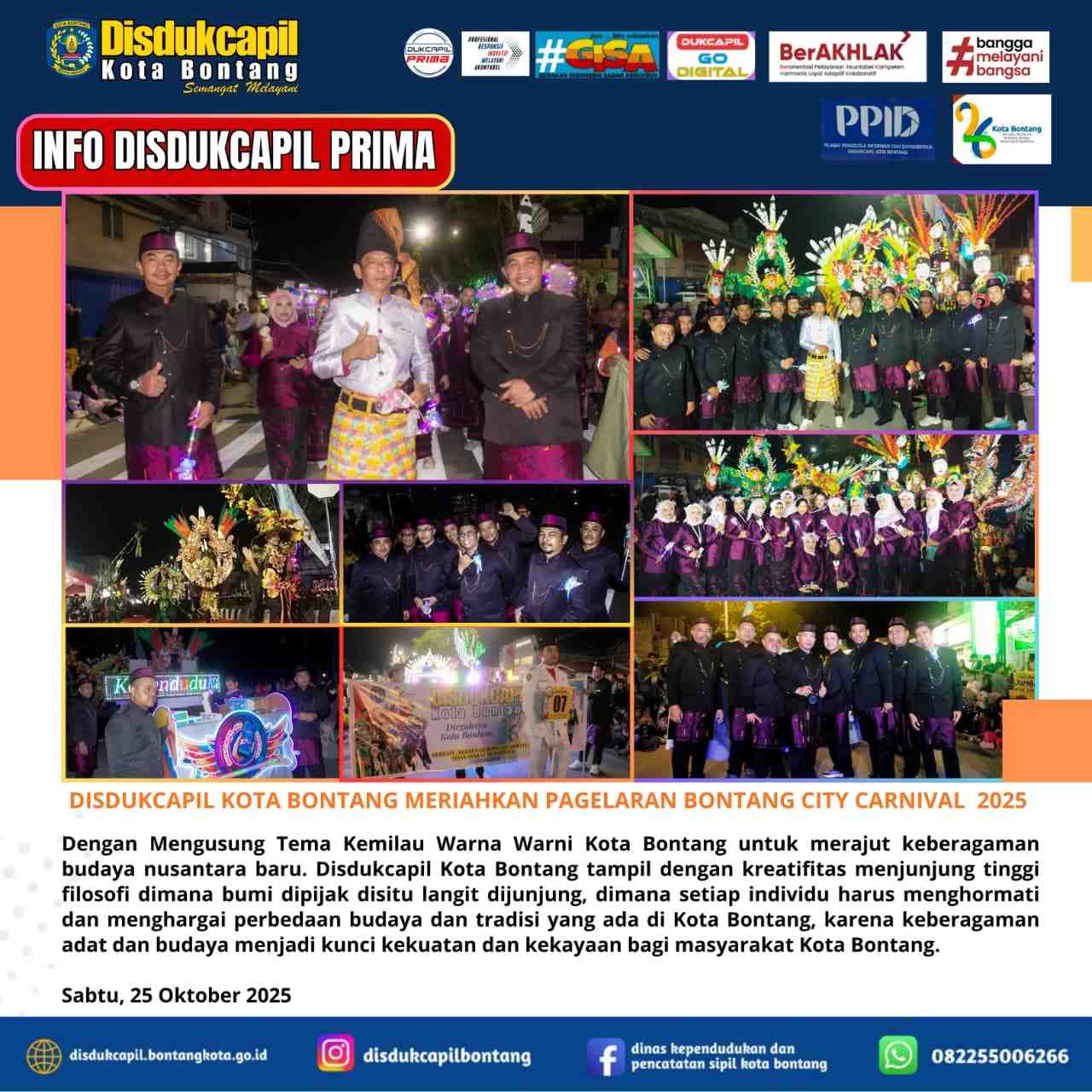 Disdukcapil Kota Bontang meriahkan pagelaran Bontang City Carnival 2025 yang digelar pada Sabtu, 25 Oktober 2025. Kegiatan ini berlangsung meriah dengan semangat kebersamaan dan kreativitas dari para peserta.