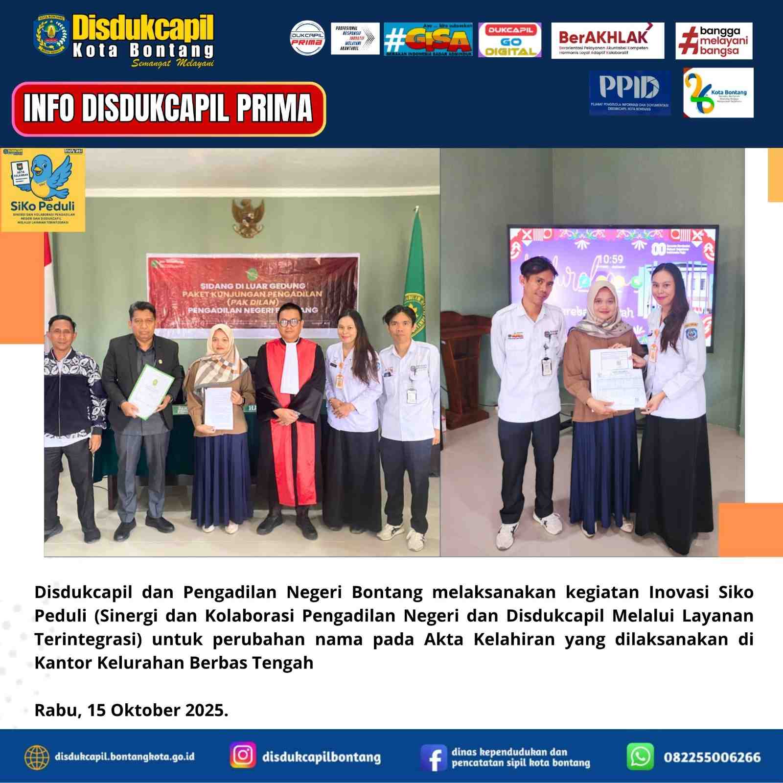 Disdukcapil Kota Bontang bersama Pengadilan Negeri Bontang kembali melaksanakan kegiatan Inovasi SiKo Peduli (Sinergi dan Kolaborasi Pengadilan Negeri dan Disdukcapil Melalui Layanan Terintegrasi) pada Rabu, 15 Oktober 2025, bertempat di Kantor Kelurahan Berbas Tengah.